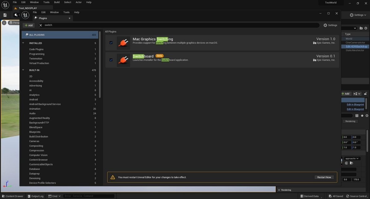 - nDisplayと、Switchboardと、Live Linkのプラグインをインストールする
