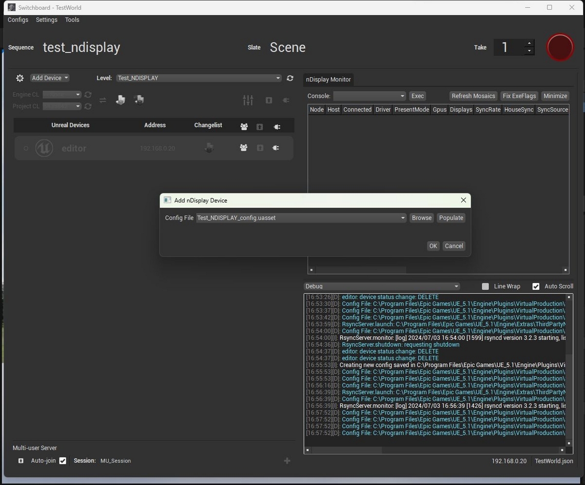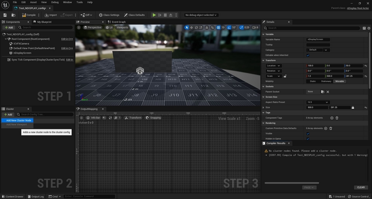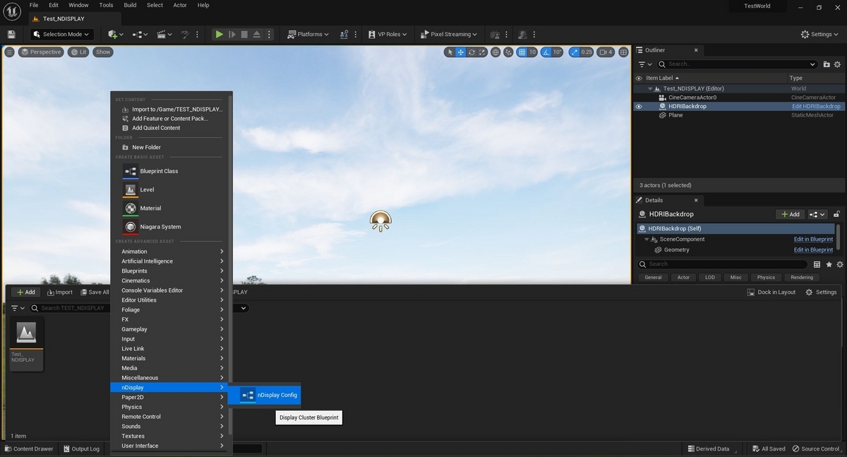 - レベル画面に戻って、nDisplay configをレベルにドラッグアンドドロップする