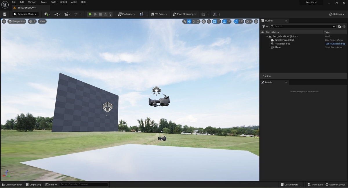 - ドラッグアンドドロップしたnDisplayのActorに、ICVFXCameraのActorが紐づけてあるので、そこにレベル上のメインカメラとするCinem Camera Actorを紐づける