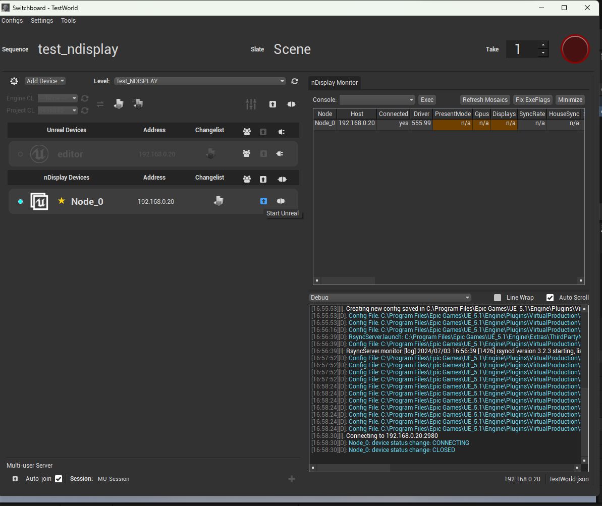 - Switchboardで、nDisplayと接続し、フルスクリーン描画を起動する